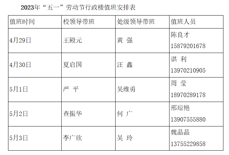 附件:2023年“五一”劳动节行政楼值班安排表
