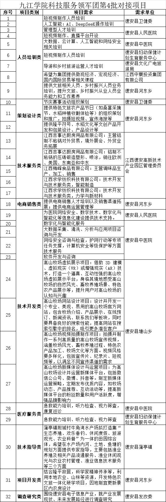 为贯彻落实《九江学院服务九江经济社会发展三年行动计划(2024-2026)》(九院党字〔2024〕66号)文件要求,通过科技服务领军团对德安县经济社会发展相关需求进行征集,确定以下32项为第4批社会服务项目,现面向全校发布项目信息。