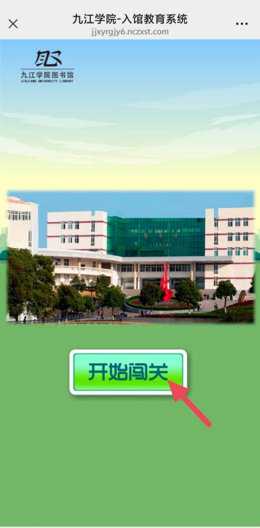 关注“九江学院图书馆”微信公众号(账号“jjxy_tsg”),点击右下角“读者服务——入馆教育”进入游戏闯关页面。
