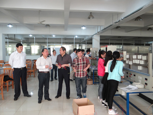 4月2日上午,校长甘筱青来到实训楼电工工艺实训室现场观摩了电子工程学院许勤副教授指导电子B1412班同学的电工工艺实训课程。学校教务处、实验中心、电子工程学院、国资处负责同志一同观摩。