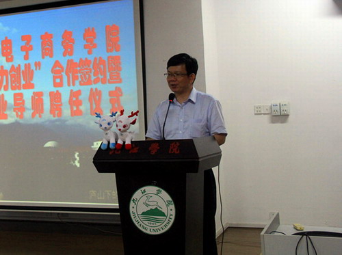会上,王副校长代表九江学院向各位远道而来参加此次仪式的校友和企业家表示热烈的欢迎和衷心的感谢。王副校长指出,在当今社会经济发展的大趋势下,企业界流行着互联网+、电子商务、O2O、企业转型等关键词,企业“互联网+”正成为未来企业发展的一个趋势。当今时代,企业不注重互联网,不注重电子商务就等于放弃未来。为响应李克强总理提出的“大众创业、万众创新”的号召,九江学院成立了电子商务学院,也是江西省第一个把电子商务独立作为一个学院来发展的学校。学校高度重视电子商务学院的发展和建设,今天,电商学院实行“创业团队培育计划”与企业进行对接是创新创业教育的一大举措,希望各位企业家朋友能与电商学院实现全面的全方位的对接,电商学院要和企业紧密联系,把对接做到实处;企业家为学生实习、实践、创业提供平台和机会,学校为企业提供人力支持和智力服务,双方是相辅相成的。最后祝愿各方同心协力,通力合作,实现共赢。