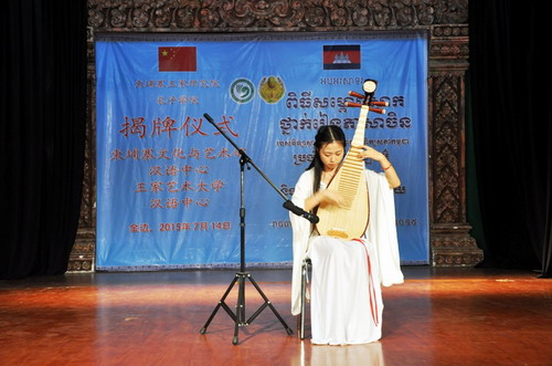 揭牌仪式前,柬埔寨王家艺术大学师生表演了手鼓舞、昌扬舞,孔子学院汉语教师志愿者宋亚洲、杨岱羲也为大家带来了武术表演和琵琶独奏。