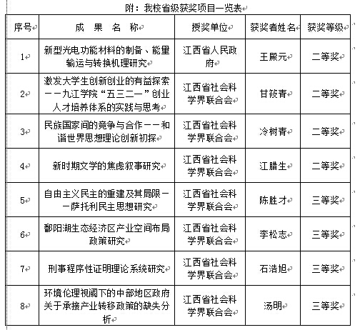 另悉,江西省社联公布了江西省第十六次社会科学优秀成果奖获奖项目。我校获七项优秀成果奖,其中甘筱青教授、冷树青教授、江腊生教授的成果分别获二等奖;陈胜才教授等4人的四项成果获得三等奖。