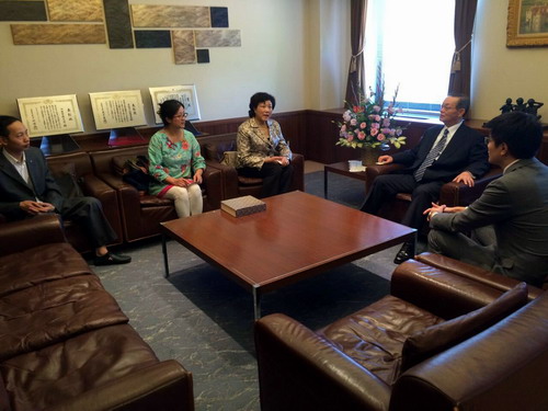 10月12日,吴桃娥副校长一行三人访问了位于日本山梨县甲府市的山梨学院大学(Yamanashi Gakuin University)。山梨学院大学校长古屋忠彦先生接见了代表团一行,并向代表团介绍了山梨学院大学同北京大学、天津南开大学、复旦大学、西安交通大学、南昌大学等学校的交流。吴副校长代表学校向古屋忠彦先生赠送了刻有九江学院校徽的精美瓷盘,向古屋忠彦先生介绍了九江学院的办学历史、区位优势、招生情况、师资力量等相关情况。双方都相信此次合作能够取得建设性的成就。