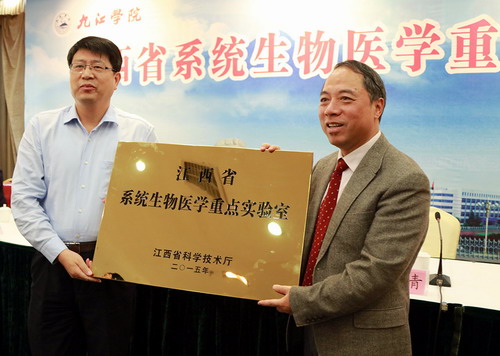 10月16日上午,江西省系统生物医学重点实验室授牌仪式在九江宾馆隆重举行,九江学院校长甘筱青致辞,副校长纪岗昌主持授牌仪式。省科技厅副厅长赵金城、省科技厅条财处副处长卢荣,九江市科技局局长李文豪、副局长汪季焜及计划科科长万小平、九江学院校科研处、实验中心和医学部一部四院负责人出席了仪式。参加仪式的还有美国科学院院士、耶鲁大学斯特林(Sterling Professor)教授、美国国家人类基因组计划发起人之一Sherman Weissman先生、耶鲁大学医学院遗传系研究员、单细胞功能基因组学技术国际前沿专家潘星华博士、美国国立卫生研究院研究员、教育部心血管重大疾病防治协同创新中心特聘客座教授和首席科学家蔡涛博士、美国国立卫生研究院研究员,美国SAIC-Frederick公司科研团队负责人喻萍博士、教育部“长江学者”奖励计划特聘教授、国家杰出青年基金获得者、南开大学杰出教授刘林博士等知名专家。