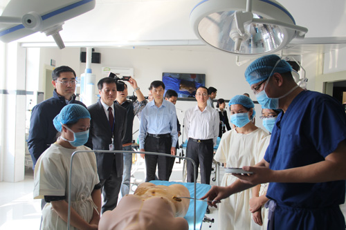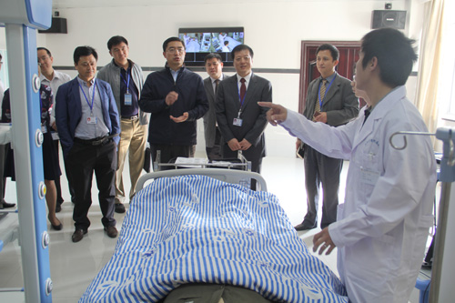 紧接着,专家组分别对医学技能训练与考核中心、临床实验教学中心、教学楼、重点科室、医学科研中心等处进行了实地走访和教学观摩。在焕然一新、改造升级的临床实验教学中心,专家组成员在陶副校长、临床医学院/附属医院党政领导的陪同下,考察了显微互动实验室、标准化实验室、影像诊断实验室、模拟产房、多功能中央监控室、模拟ICU和外科实验室等,重点观摩了高级产妇综合模拟人自然分娩,外科消毒铺巾、洗手穿衣,影像读片等实验项目,对ICU实验室的高端智能综合模拟人进行了了解,对中央监控室的功能进行了考察。实验中心门类齐全、设备先进、功能完备、环境整洁,各实验带教老师讲解全面,得到了专家的好评。