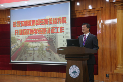 汇报会上,专家组组长闻德亮教授主持会议并代表教育部临床医学专业认证工作委员会讲话,指出:今天是我们入校考察的第二天,开始对临床医学院认证工作进行正式考察,主要是通过听取汇报、座谈、现场走访等形式对临床医学院办学情况进行验证。