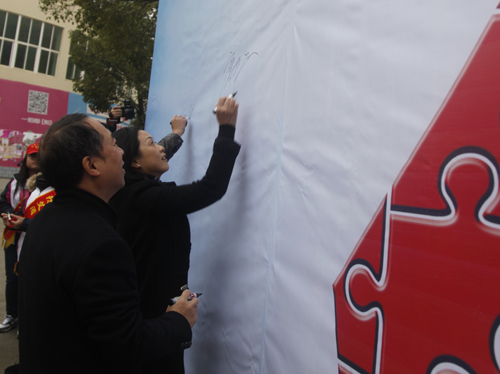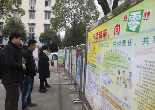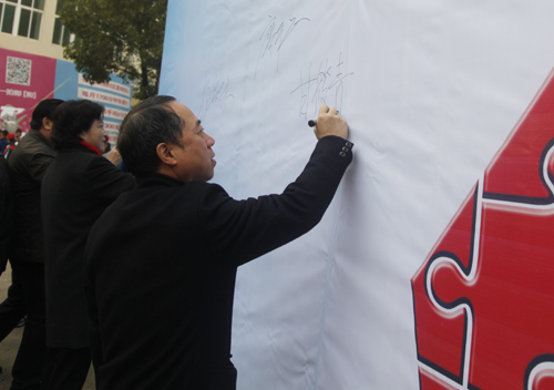 今年的“世界艾滋病日”系列宣传活动以“行动起来 向‘零艾滋’迈进为主题”。在活动现场,出席仪式的廖奇志、甘筱青等领导带上红丝带,并在主题宣传画上签名,自觉参与预防艾滋病宣传,以实际行动号召在校大学生合力抗艾,共担责任,共享未来。