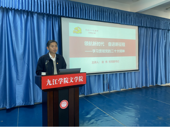 3月10日上午,校党委书记赵伟在文友楼204教室为文学院汉语言文学专业联系班级和文学院第二届濂溪读书班学生讲授“开学第一课”,赵伟以《领航新时代 奋进新征程——学习贯彻党的二十大精神》为主题作专题宣讲报告。