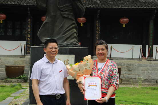 在朱熹塑像前,我校副校长李松志博士为郑州大学文化素质教育办公室主任吴艳利老师颁发了“传承书院文化 丰润两校友谊 十六载功在不弃”的荣誉证书。