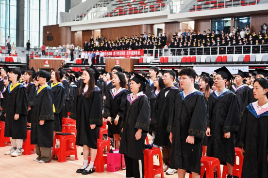 典礼开始之前,现场各位毕业生共唱《祝你一路顺风》《凤凰花开的路口》《明天,你好》等歌曲,回忆走过的青葱岁月,展望广阔的新征程。毕业典礼在雄壮的国歌声中拉开帷幕。