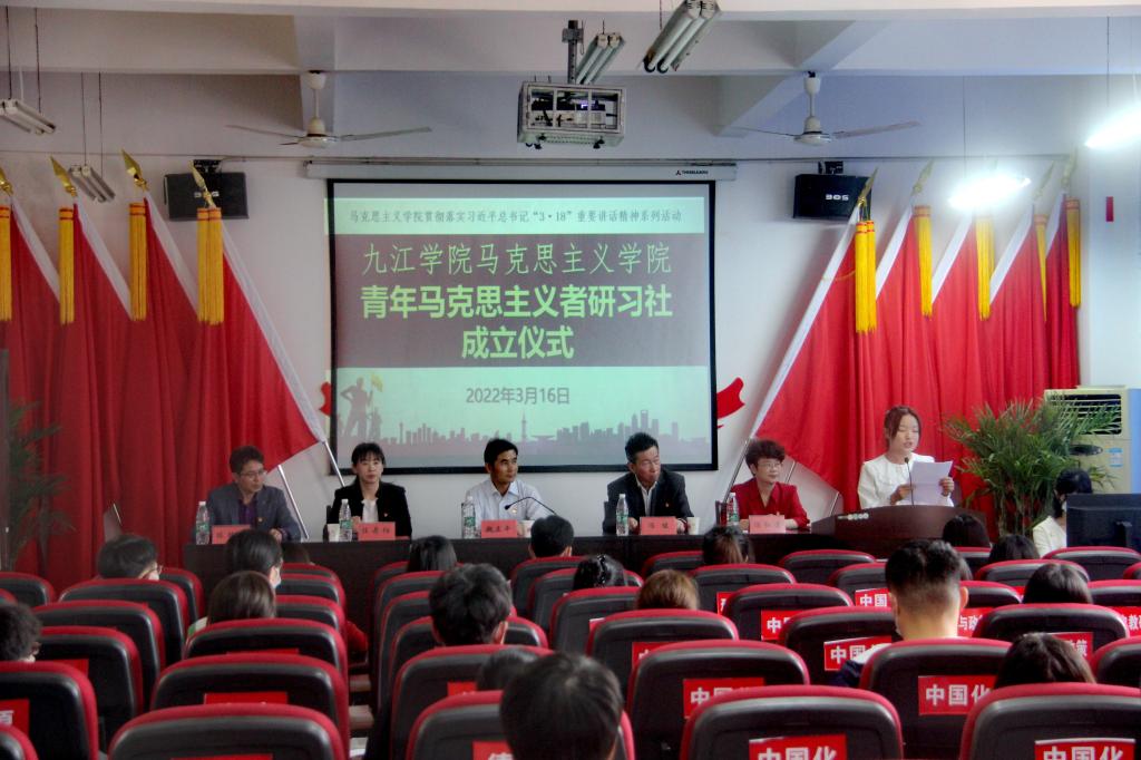 打造学校首个红色思政社团。学校在擦亮“文心琢玉”思政工作品牌的基础上,成立以“研习马克思主义,传承红色基因,争当时代新人”为宗旨的九江学院青年马克思主义者研习社,积极支持和引导青年大学生学习和宣传马克思主义尤其是中国当代马克思主义——习近平新时代中国特色社会主义思想。研习社每半年组织1期“触摸经典”读书班,每期配备5名思政课教师作为指导教师,每期招收30名左右的学生。通过“师生共读一本书”的方式,引导学生学习《共产党宣言》《毛泽东传》《习近平的七年知青岁月》《问道马克思——为什么信仰马克思主义?》等,开展“世界读书日活动”“每日清晨诵读打卡”“每周小组分享”“每月师生交流”“精彩读书笔记展示”等特色活动,督促学生扎扎实实学习马克思主义理论,帮助学生深入学习领会习近平新时代中国特色社会主义思想的核心要义,自觉做习近平新时代中国特色社会主义思想的坚定信仰者、忠实实践者。党的二十大胜利召开以后,研习社迅速行动,精心组织社团成员开展理论学习活动,成立了“青马研习社学习宣传党的二十大精神学生宣讲团”,在校团委的统一安排下,到各二级学院学生中开展理论宣讲活动。成立以来,该社团坚持将思想政治教育根植社团建设,形成了政治性强、理论性深、趣味性浓、特色鲜明、覆盖面广的社团文化育人的生动局面,成为学校马克思主义理论宣传和实践的前沿阵地。