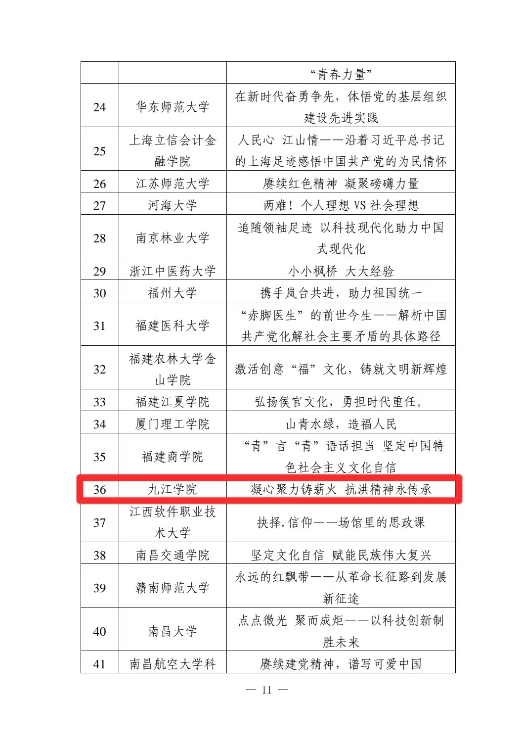 近日,由教育部高校思想政治理论课教学指导委员会主办,南开大学马克思主义学院承办的“新思想引领新征程·新青年建功新时代”——第七届全国高校大学生讲思政课公开课展示活动评审结果公布,由我校教师胡艳月、王琰和余建明指导,由九江学院临床医学院学生樊江海、郭子玉、岳奋芪、黎玄、叶建敏、徐丹创作的公开课《凝心聚力铸薪火 抗洪精神永传承》荣获本科组二等奖,为我校再添全国奖!