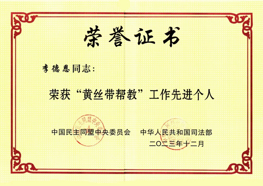 “黄丝带帮教”行动是由民盟中央和司法部联合发起的针对罪犯等特殊人群开展关怀、帮扶和教育救治,促使他们更好回归社会的一项全国性公益性活动。我校法学院李德恩教授发挥自身智力优势,助力我市司法行政部门做好社会管理工作,积极参与“黄丝带帮教”行动,坚持开展特殊人群的帮扶引导实践,用真心和热情去感化每一位需要帮助的人,获得了良好的社会反响。