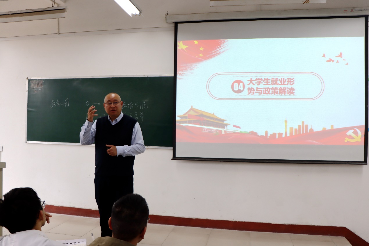 李明斌在课堂上与同学们充分互动,以一名师长的情怀娓娓道来,以丰富的数据深入浅出地解读了近年来高校毕业生就业整体形势,希望广大同学要对就业形势有清醒的认识,要积极适应市场的变化,合理设定就业目标,要提高自身就业能力,要熟悉了解并用好国家、省、市、学校支持毕业生就业创业政策,要用好各类求职招聘平台,要积极投入到学校的各类线下招聘活动中去,要抓住求职过程中的先机,早决定早上岗,在和时代的同向而行中实现个人与时代的共同成就。