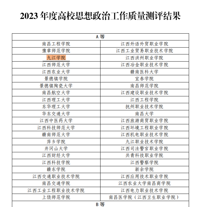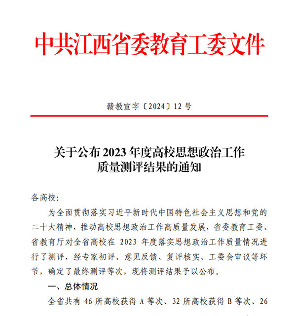 近日,省委教育工委发布《关于公布2023年度高校思想政治工作质量测评结果的通知》,我校再次获评A等,并位居全省本科高校前列。
