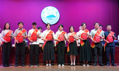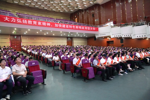 兴国必先重教,重教必先强师。9月9日上午,我校在大礼堂召开庆祝第40个教师节暨表彰大会。学校2023-2024学年优秀教师代表、优秀教育工作者代表、优秀辅导员代表、优秀班主任代表、先进集体代表、长期从教教师代表、新入职教师代表,师生代表,各职能部门主要领导、各学院党政主要领导等共计500余人参加大会。