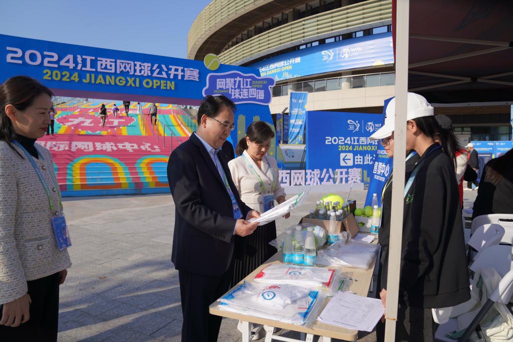 江西网球公开赛联合赛事总监沈红斌,九江市体育局党组书记、局长刘金梅,江西省体发公司相关负责人,以及我校党政办、团委、体育学院负责人等陪同。