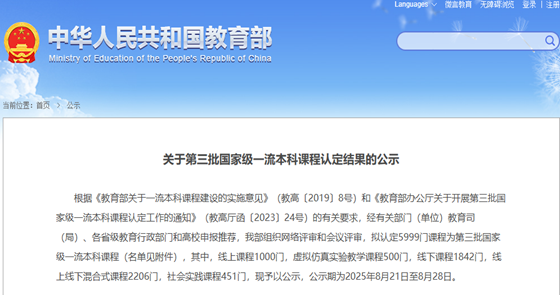 近日,教育部发布了《关于第三批国家级一流本科课程认定结果的公示》,我校《中小学英语课程与教学论》等6门课程成功入选,涵盖线上、线上线下混合式、社会实践等多个类型。至此,本轮国家级和省级一流本科课程认定工作圆满收官,我校共获批国家级一流本科课程12门,省级一流本科课程67门。