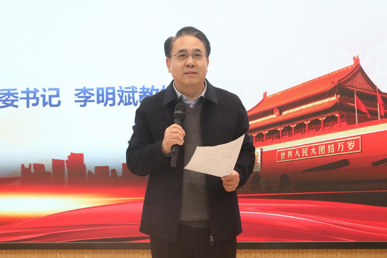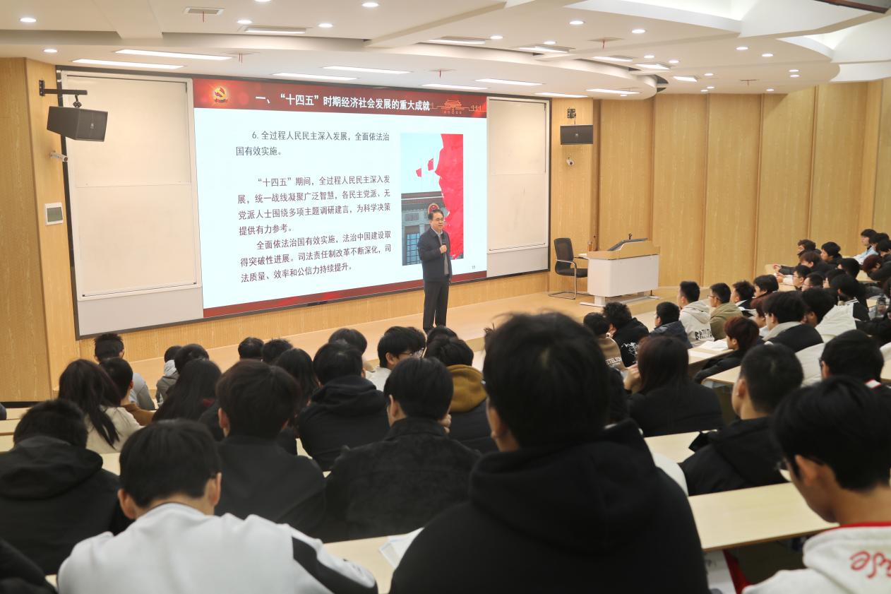 李明斌指出,党的二十届四中全会审议通过的《建议》,科学把握了我国发展新的历史阶段特征,深刻分析了国内外环境的深刻变化,明确提出了未来五年发展的指导思想、主要目标和重点任务,是指导我们迈向社会主义现代化的重要纲领性文件。他结合国家发展大局与高等教育使命,强调青年学生正处于成长成才的关键时期,也是国家现代化建设的生力军。他勉励同学们要坚定理想信念,胸怀“国之大者”,自觉将个人追求融入党和国家事业发展;要夯实专业基础,锤炼过硬本领,努力成为可堪大用、能担重任的栋梁之材;要勇担时代责任,积极投身实践,在中国式现代化的广阔舞台上贡献青春力量。