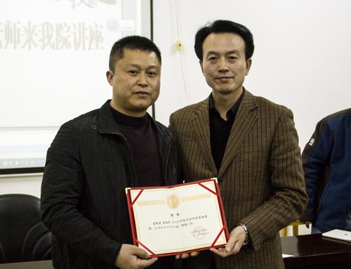 讲座前,在一阵热烈的掌声中,吴维勇院长代表学院向曹端阳老师颁发艺术学院客座教授的聘书。