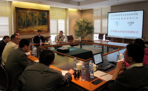 在与江中药业股份有限公司合作多年的基础上,通过前期的联系和筹备,4月20日上午,药学与生命科学学院院长廖亮、副院长张小谷、院长助理吴家忠等一行五人赴南昌与江中药业股份有限公司举行产学研合作基地签约挂牌仪式,仪式在江中集团医药谷商务中心隆重举行。江中集团部长刘立新、江中药业基地总经理罗文华、生产总监陈培武、人力总监李希堃以及人力资源部经理杨仁慧参加本次签约挂牌仪式。仪式由江中药业股份有限公司人力总监李希堃主持。