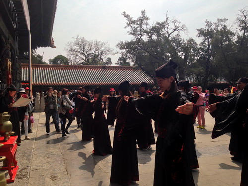 4月24日上午,奖学金生们来到了国学之旅的第一站曲阜。在曲阜明故城万仞宫墙前广场,观看传统的开城迎宾仪式。随后,留学生们身着汉服走进孔庙,驻足于历代帝王的众多手书匾额及碑文石刻,了解孔子和孔子的思想,感受儒家传统文化的魅力。孔庙大成殿前,在礼仪师的引导下,同学们身着汉服,进行了庄严的拜师仪式,向孔子雕像行鞠躬礼,以表达对至圣先师孔子的敬仰之情。
