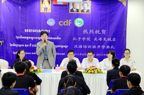 4月29日,柬埔寨王家研究院孔子学院吴哥免税店汉语班举行开班仪式。柬埔寨王家研究院孔子学院院长谢莫尼勒(Chea Munyrith)、中国免税品集团柬埔寨有限公司赵远昭董事兼总经理分别致辞。