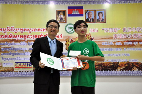 经过激烈的角逐,端华学校的蔡佑鑫以19.36分的优异成绩夺得桂冠。他情深意切的用流利进行得演讲打动了评委,他反串形式的《新贵妃醉酒》更是让大家眼前一亮,博得阵阵喝彩声。赛后他难以抑制他激动的心情,因为这已经是他第三次参加“汉语桥”世界中学生中文比赛,只为了实现自己心中的“中国梦”、“汉语梦”。而今年,他终于实现了自己的梦想。他表示在今后的比赛中他将继续拼搏,用汉语与世界沟通。今天决赛的前4名蔡佑鑫、黄妮佳、邬美美、程丽叶等将代表柬埔寨赴中国参加第八届“汉语桥”世界中学生中文比赛的总决赛。在去年的“汉语桥”世界中学生中文比赛中,柬埔寨中学生代表队荣获团体优胜奖、个人综合一等奖、个人综合二等奖的优秀成绩。