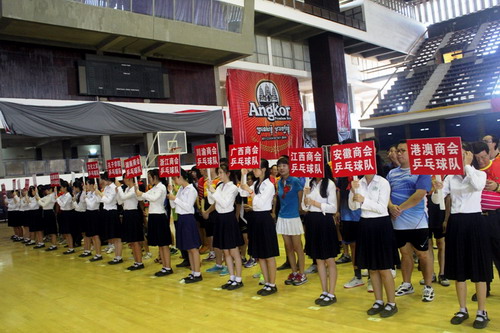 5月31日上午,柬埔寨首届“吴哥啤酒杯”华人华侨乒乓球赛在奥林匹克运动场隆重举行开幕仪式。中国驻柬大使馆杨庆连主任、主办方柬埔寨湖南商会会长李波宁、执行会长吴光华、乒乓球协会主席庄明强、吴哥啤酒郑官孔子学院帅式毅、港澳商会及各商会、学校代表数百人出席参加。