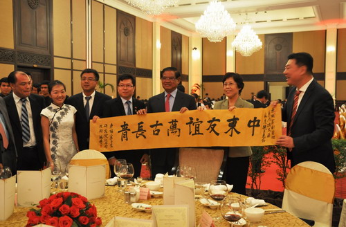 庆典仪式上当然少不了孔子学院师生的中华文化展示。汉语教师志愿者宋亚洲老师的武术精彩绝伦,杨黛羲老师的古筝似高山流水,樊瑞娟老师的书法苍劲有力。樊瑞娟现场书法后,将写就的“中柬友谊万古长青”赠予副总理苏庆亲王,以表达对中柬友谊的美好祝愿,苏庆亲王非常愉快地和孔子学院师生们合影,他对谢莫尼勒院长说,孔子学院师生的表现很好,要继续加大在柬埔寨的汉语推广力度。孔子学院赠送的“以中国情怀、兴商会事业”的对联给高华会长带来的是惊喜。王家研究院孔子学院亚欧大学中文系的学生们也依次带来动听的中、柬文歌曲串烧,获掌声不断。
