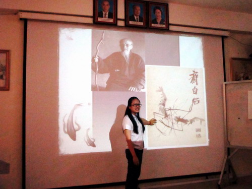 7月17日,柬埔寨王家研究院孔子学院在孔子学院二楼影音室举行“每周中国文化活动”之中国国画文化讲座。为了让孔子学院的更多学生了解和体验到中国文化,此次的“每周中国文化活动”时间改为11点——12点。本次讲座的主讲者为九江学院选派的孔子学院汉语教师志愿者周亚莉,孔子学院师生代表共50余人参与了此次活动,柬埔寨新闻频道(CNC)全程录播。