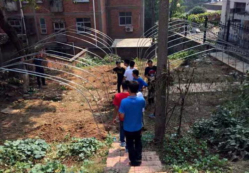 在学院的大力支持下,10月16-18日,学院利用运动会和周末时间,学院团委积极组织同学们进行创业基地的基础建设,把已经建好的铁皮屋认真整理,打扫干净整洁。同时,同学们又整理出一块空地,在空地上搭建两个钢管大棚。搭建大棚没有人指导,大家边做边思考,尽量按照图片上图样搭建。由于空地上建筑垃圾很多,埋钢管的洞很难挖,有的同学的手都磨起了水泡,但是大家都没有埋怨,认为是一次锻炼的机会,都想进入创业基地锻炼。