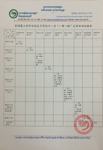 据悉,柬埔寨王家研究院孔子学院把2015年11月定为“一带一路”宣传活动月,除制作了《三分钟了解“一带一路”》专题片在柬埔寨主要电视台(CNC 新闻频道、TVK 国家电视台, Apsara TV 人民党电视台等)循环播放之外,并在孔子学院的汉语中心安排了8场讲座。