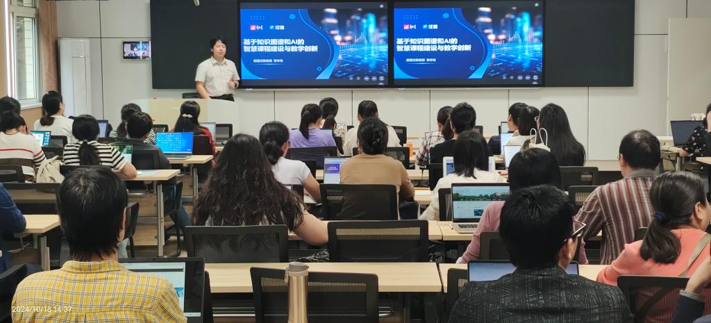 培训中,曹冬铭从为什么建设智慧课程、什么是智慧课程、怎样建设智慧课程以及如何使用智慧课程四个维度进行了深入分析并借助超星教学平台进行展示,清晰地阐述了AI助教与知识图谱对教学的赋能与创新。然后通过现场演示的方式,展示了AI助教的功能介绍、使用技巧等。此外,还分享了知识图谱如何帮助教师构建系统化的教学内容体系,实现知识的精准推送与个性化学习路径规划以及AI助教在促进师生互动、激发学习兴趣等方面的内容。