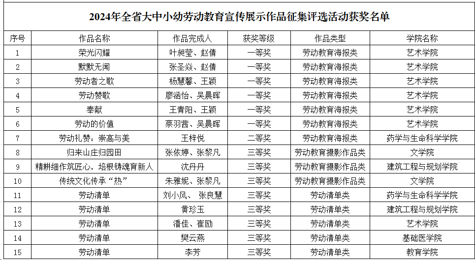 近日,江西省教育厅发布了《关于公布2024年全省大中小幼劳动教育宣传展示作品征集评选活动获奖名单的通知》(赣教体艺办函〔2025〕5号)。我校推荐的劳动教育宣传展示作品荣获佳绩,获奖作品15项 ,其中在“劳动教育海报类”本科组评选中,“荣光闪耀”“默默无闻”“劳动者之歌”“劳动赞歌”“奉献”“劳动的价值”作品荣获一等奖,“劳动礼赞:崇高与美”作品荣获二等奖;在“劳动教育摄影作品类”高校组评选中,“归来山庄归园田”“精耕细作筑匠心,培根铸魂育新人”“传统文化传承‘热’”作品荣获三等奖;在“劳动清单”本科组评选中,共有五份作品荣获三等奖。