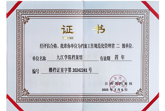 近日,江西省档案局公布《2024年江西省档案工作规范化管理等级单位名录》,九江学院档案馆获批“档案工作规范化管理省二级单位”。
