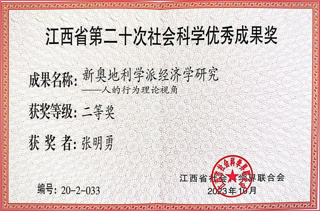 张明勇博士2023年获得省级社会科学优秀成果二等奖