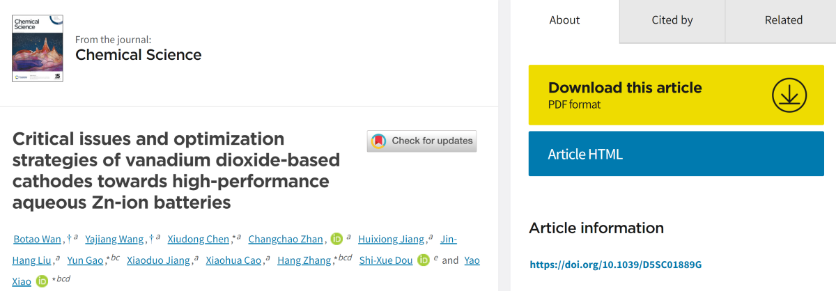 近日,在化学化工学院陈修栋教授团队的精心指导下,我校材料化学专业A2341班万博涛同学以第一作者身份,在《Chemical Science》(化学科学)上发表题为“Critical Issues and Optimization Strategies of Vanadium Dioxide-Based Cathodes Towards High-Performance Aqueous Zn-Ion Batteries”的综述性学术论文。