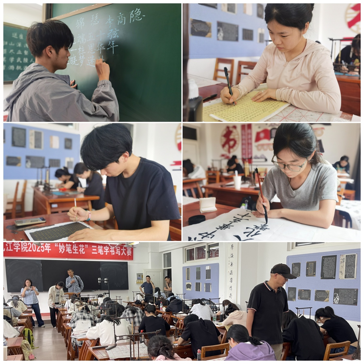 5月24日上午,由国家语言文字推广基地(九江学院)指导、教务处主办、教育学院承办的九江学院2025年“妙笔生花”三笔字书写大赛在竞知楼三笔字实训室圆满落幕。大赛面向全体在校学生,分为初赛和决赛两阶段,历时一个月,共收到硬笔、毛笔、粉笔三类作品近200件。此次大赛不仅为优秀学子搭建了展示平台,更通过以赛促学的方式推动了校园文化建设。