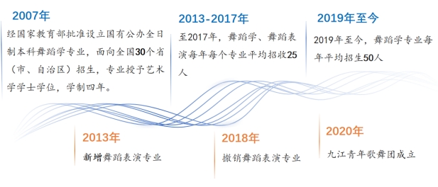 2007年经国家教育部批准设立国有公办全日制本科舞蹈学专业,面向全国30个省(自治区、直辖市)招生,专业授予艺术学学士学位,学制四年。2013年新增舞蹈表演专业,2013—2017年舞蹈学、舞蹈表演每年各专业均招收25人。2018年,撤销舞蹈表演专业。2019年至今,舞蹈学专业平均每年招生50人。