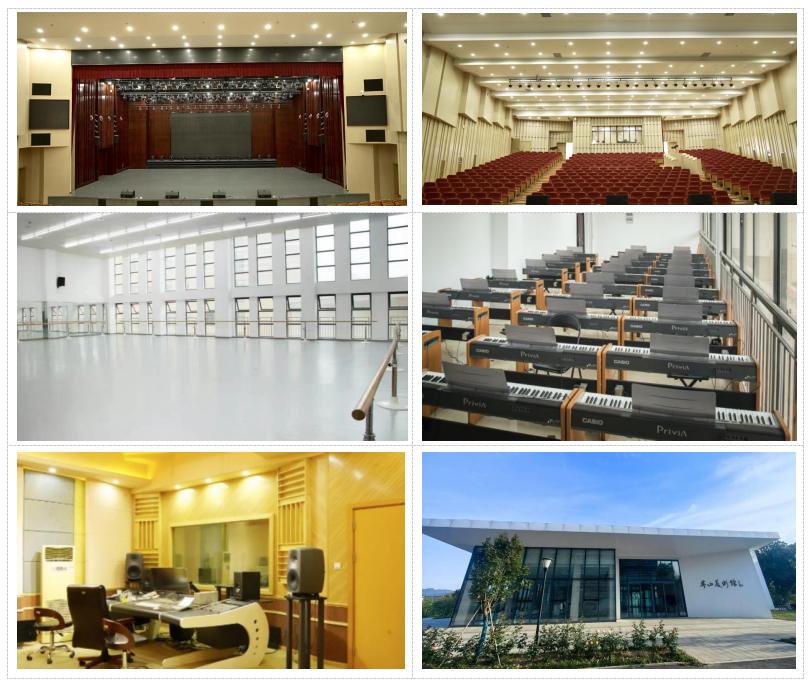 艺术学院园区总建筑面积60749.5平方米,其中,艺术楼建筑面积29631.57平方米,学生宿舍面积26351.08平方米,食堂面积4766.85平方米。艺术园区与主校区一桥相连。园区内艺术大楼、学生宿舍、艺苑餐厅自成一体,办学条件设施一流。学校设有大剧场1个(容坐1200人)、音乐厅1个(容坐500人)、电钢教室2间、录影棚1间、琴房172间、舞蹈排练厅5间、智慧教室2间,为舞蹈专业办学提供了全方位的硬件保障。