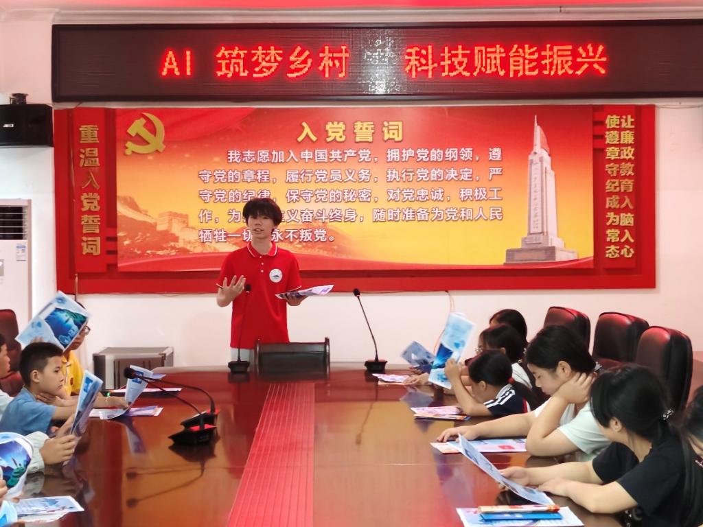 实践队走进金竹畲族乡民族学校,与当地学生齐唱红歌、共跳竹竿舞,以趣味党史课传承红色基因。队员们还在乡政府报告厅为留守儿童举办防溺水、普通话推广及“AI赋能乡村振兴”主题宣讲,并捐赠学习用品与文体器材。在彩绘村走访调研中,队员们发放了法治与防溺水宣传手册,以“拉家常”方式普及防诈知识,用实际行动助力民族融合与乡村治理。