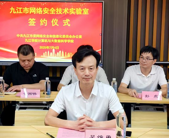7月4日,九江学院计算机与大数据科学学院与九江市委网络安全和信息化委员会办公室(市委网信办)共建“九江市网络安全技术实验室”签约揭牌仪式在九江学院电子实验楼602举行,副校长吴维勇出席仪式并致辞。市委宣传部副部长、市委网信办主任欧阳小竹,市委网信办副主任徐世海参加仪式活动。校党委委员、宣传部部长刘平,实验中心及信息技术中心负责人共同见证“九江市网络安全技术实验室”签约揭牌。