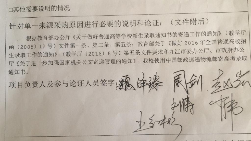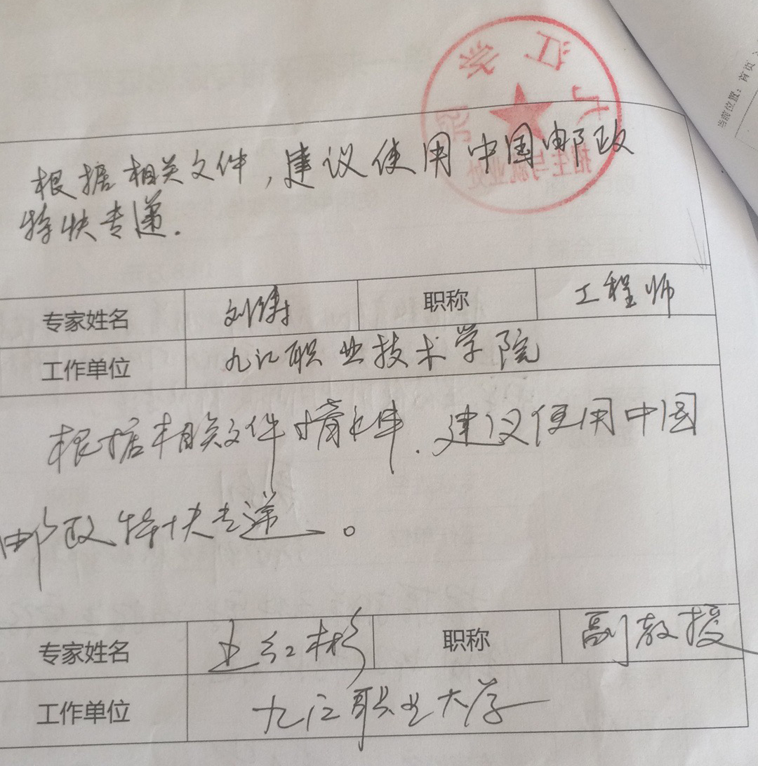 我校拟采用单一来源方式采购邮寄服务项目,现将采购项目有关情况向潜在供应商征求意见(采购项目有关情况见后文),潜在供应商对公示内容有异议的,请于公示期满后一个工作日内以实名书面(包括联系人、地址、联系电话)形式将意见反馈至九江学院招投标采购管理办公室(地址:九江市庐山区前进东路551号,联系人:张艳军,联系电话:0792-8311203)。