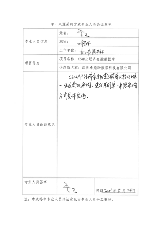 采用单一来源采购方式的原因及说明:CSMAR经济金融数据库是由深圳希施玛数据科技有限公司自主研发,为此该项目只能由深圳希施玛数据科技有限公司提供,建议采用单一来源采购方式,由深圳希施玛数据科技有限公司具体实施。
