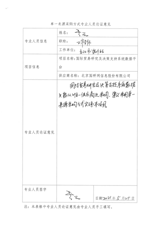 采用单一来源采购方式的原因及说明:”国际贸易研究及决策支持系统数据平台“项目是由北京国研网信息股份有限公司自主研发,符合政府采购单一来源采购情形,为此建议采用单一来源采购方式,由北京国研网信息股份有限公司具体实施。