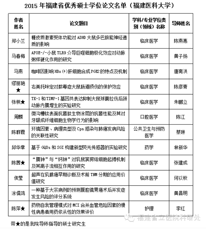 近日,福建省学位委员会、教育厅下发《关于公布2015年福建省研究生优秀学位论文评选结果的通知》(闽学位〔2016〕1号),公布了福建省学位委员会评选出的福建省优秀博士学位论文79篇、优秀硕士学位论文198篇。我院导师指导的4位硕士研究生:张枫(导师:朱鹏立)、陈萍(导师:李红)、陈茜(导师:张建成)、缪丽艳(导师:陈彦青)的硕士学位论文被评为2015年福建省优秀硕士研究生学位论文(详见下表)。