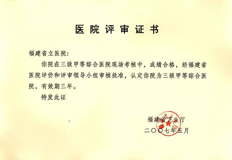 福建省立医院三甲评审证书