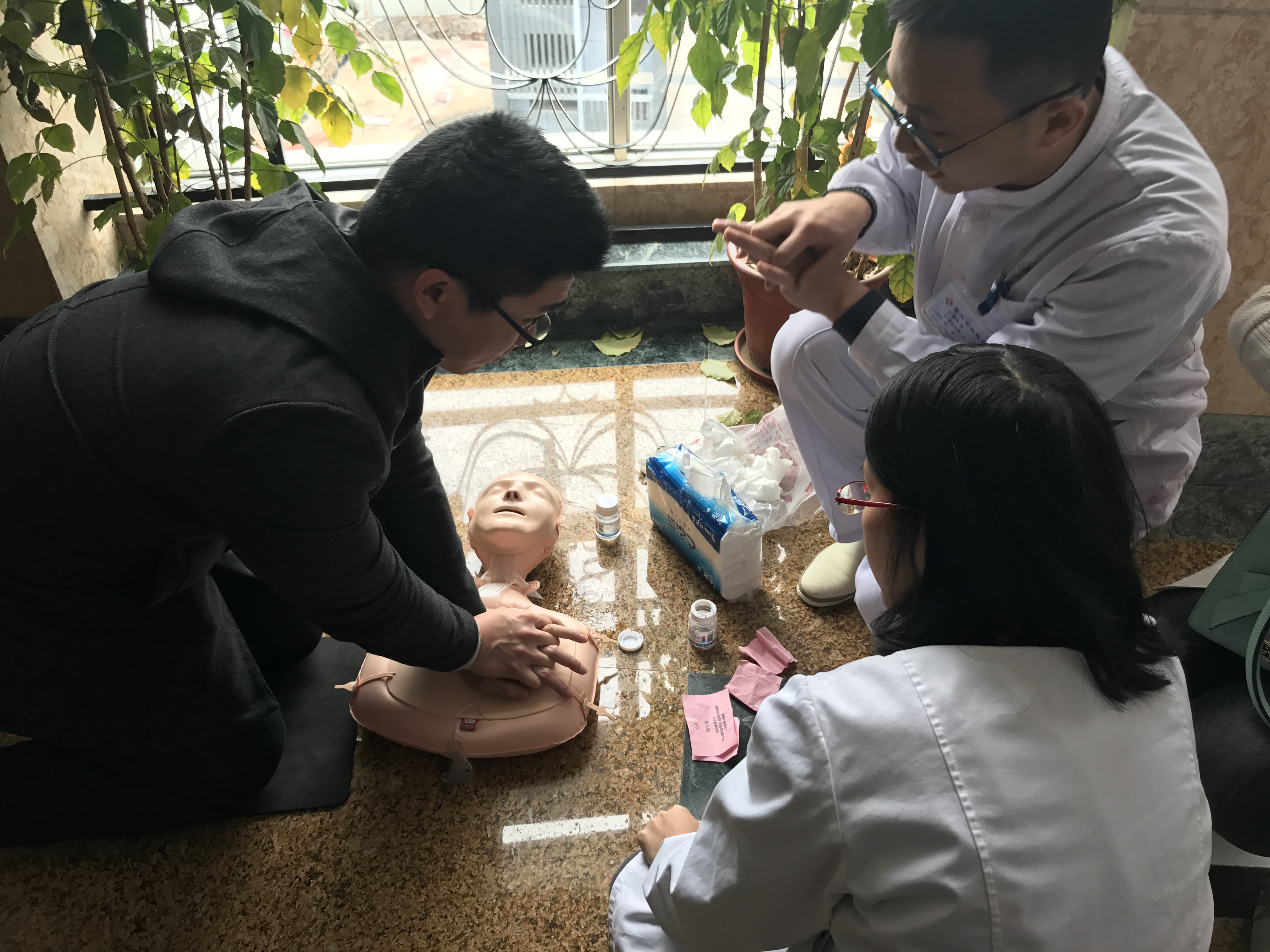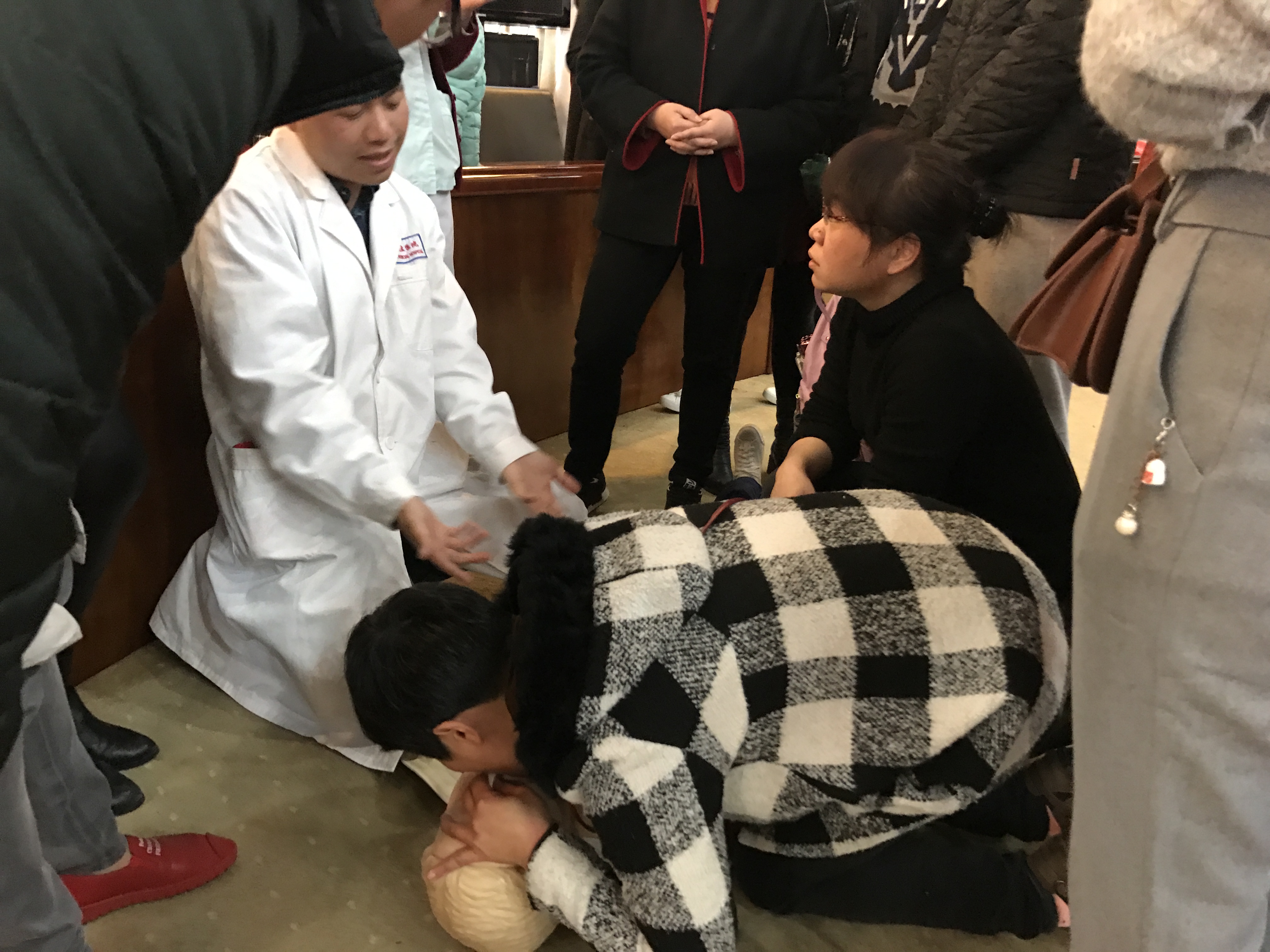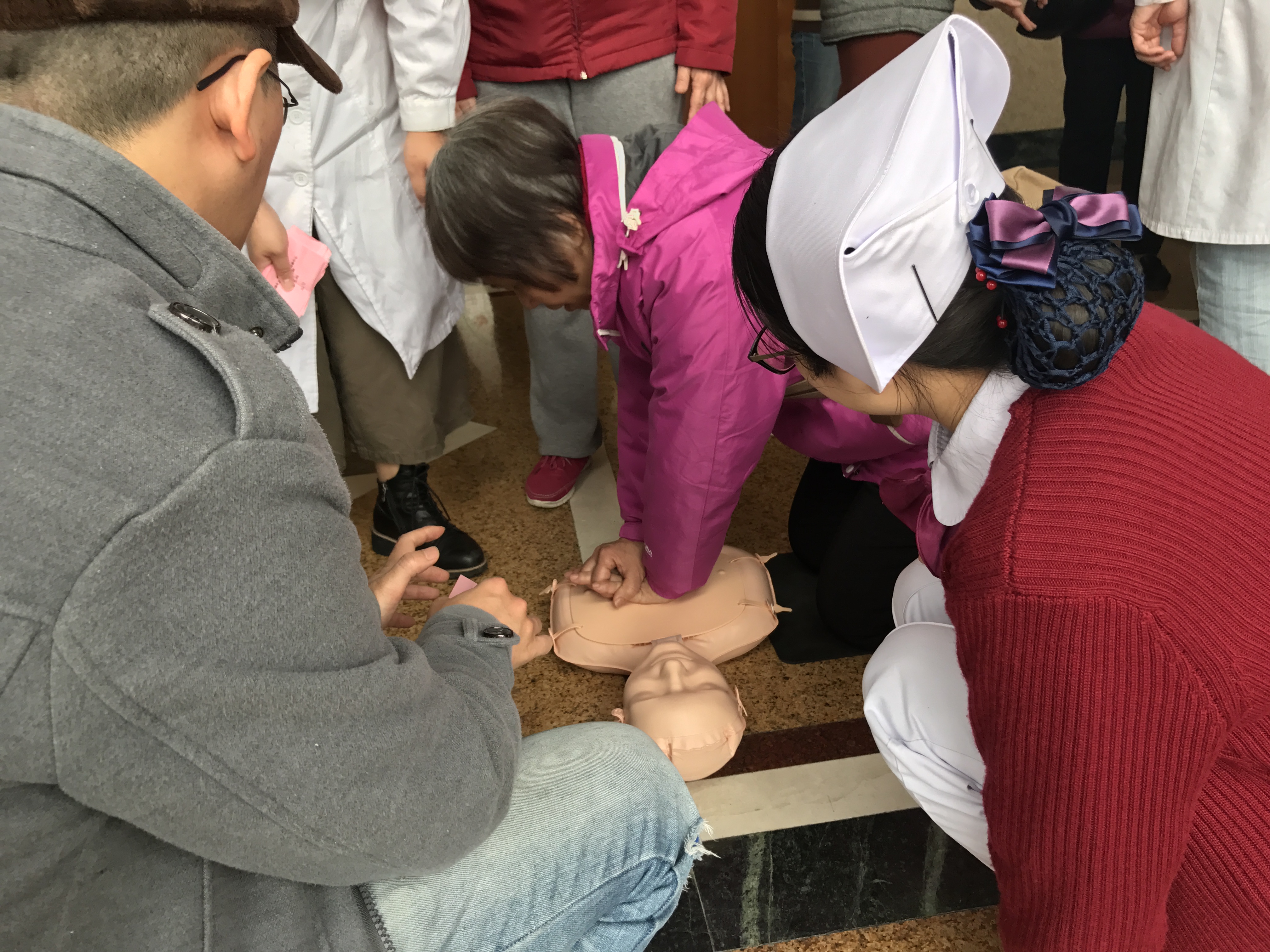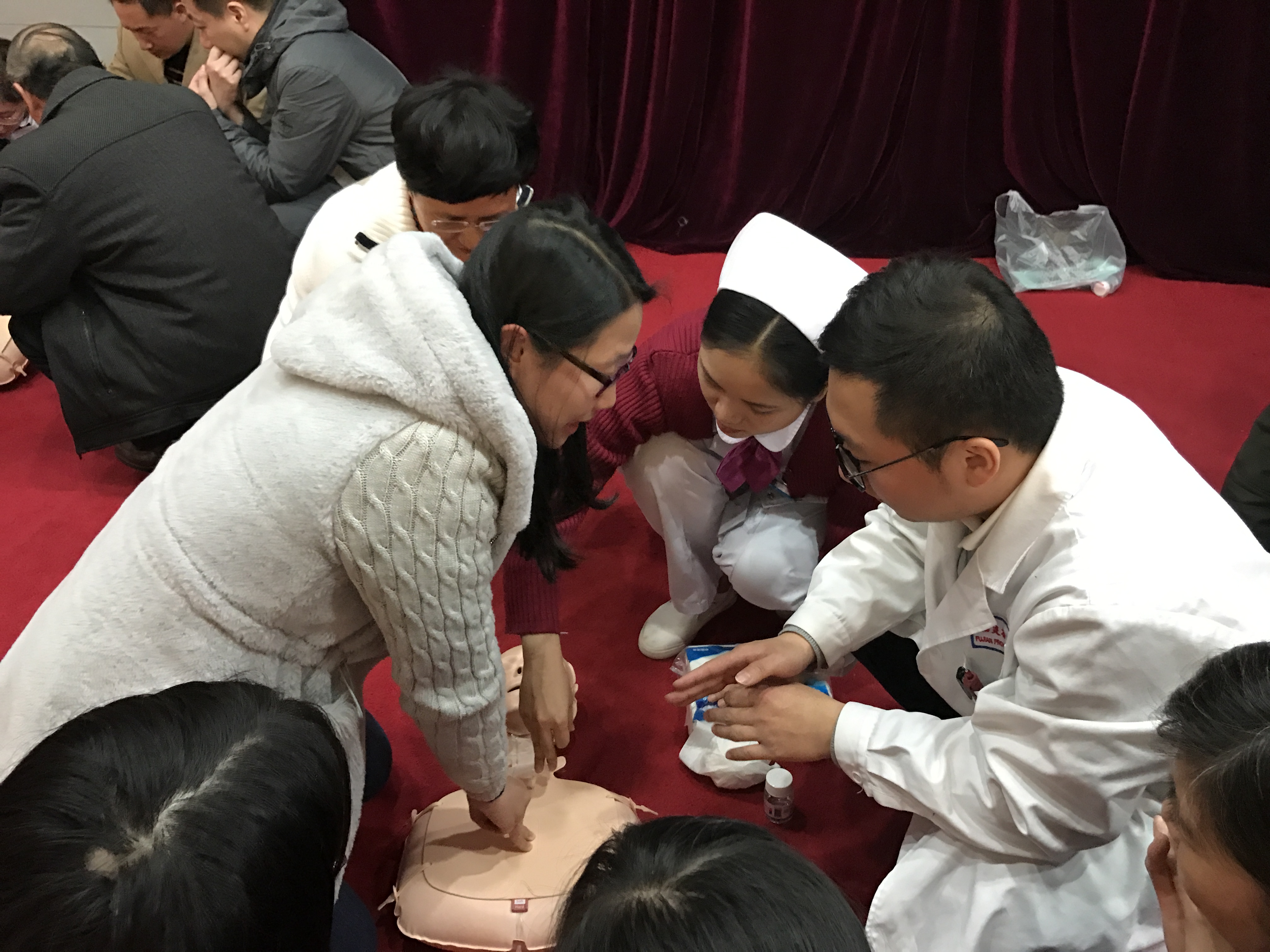 纸上得来终觉浅,绝知此事要躬行。与以往不同的是,此次培训不只停留于“看”,更注重“练”。为此,我院特意准备了十个模拟人,由专业的医生、护士分组带领观众实战演练,手把手逐一指导。